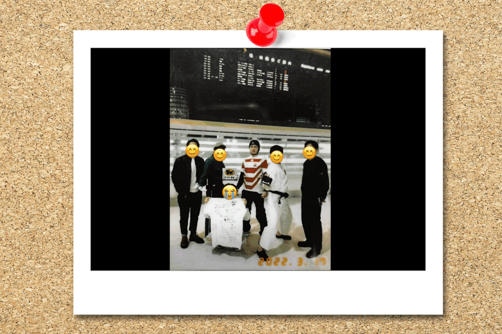 大学3 年の時、友達のブラジル留学に行くことになり、空港までお見送りをしに行きました。その際に、みんなで空手家やヤマト配達員などのコスプレをした思い出の写真です。僕はラグビー日本代表の格好しています。今もスマホケースの裏面に入れて持ち歩いています。